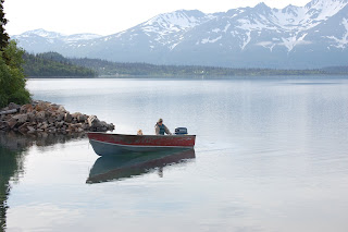 We celebrated the 4th of July with everyone from the village, hanging out on a beautiful beach, eating good food and skipping rocks into the bay. We watched the village get ready for the fish to come, everyone putting their nets out and getting their knives sharpened and their smoke houses ready. We learned from the women of the village the best ways to gut and clean salmon. It's the man's job to fish and the women's job to gut, clean and can...needless to say we helped Jason pull fish from the nets and he gutted and cleaned them. Teresa did all of the canning... except for the fish we made into Sushi. Jason taught me all about what to do if we came across a bear...never happened but if it does I'll definitely be more prepared. We got excited when it was a mail day or when the food plane arrived in the village. We took lots of 4 wheeler rides looking for wildlife but only saw lots and lots of bear poop and bear and moose tracks. We took long boat rides and explored places that I'm sure have never been explored by humans. I am so grateful to have had this experience and to have shared it with Anna. Enjoy the pictures!